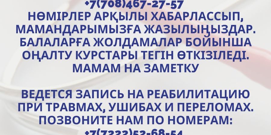 Достар, бізде жарақаттар, көгерулер мен сынықтар кездерінде оңалту жүргізуге жазылым өтуде. +7(7222)52-68-54, +7(708)467-26-09, +7(708)467-27-57 нөмірлер арқылы хабарлассып, мамандарымызға жазылыңыздар. Балаларға жолдамалар бойынша оңалту курстары тегін өткізіледі.